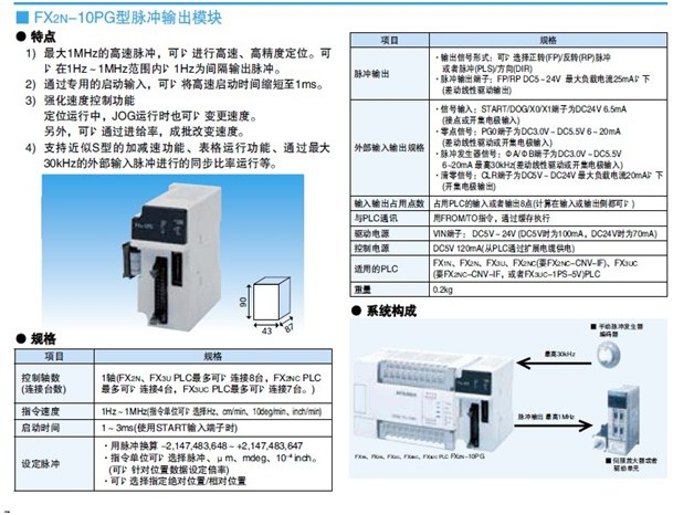 三菱定位模塊FX2N-10PG特點(diǎn):最大1MHz高速脈沖輸出,可在1Hz~1MHz間以1Hz間歇頻率輸出,從專用的啟動(dòng)端子可輸出最短1ms脈沖串,定位運(yùn)行中和JOG中可自由改變運(yùn)行(強(qiáng)化位置*速度運(yùn)行功能),另外,裝載了通過覆蓋寫入的速度批次變更功能,近似S形加/減速功能,控制臺(tái)運(yùn)行功能,對(duì)應(yīng)最大30Hz外部輸入脈沖同步比率運(yùn)行等軸數(shù):1軸